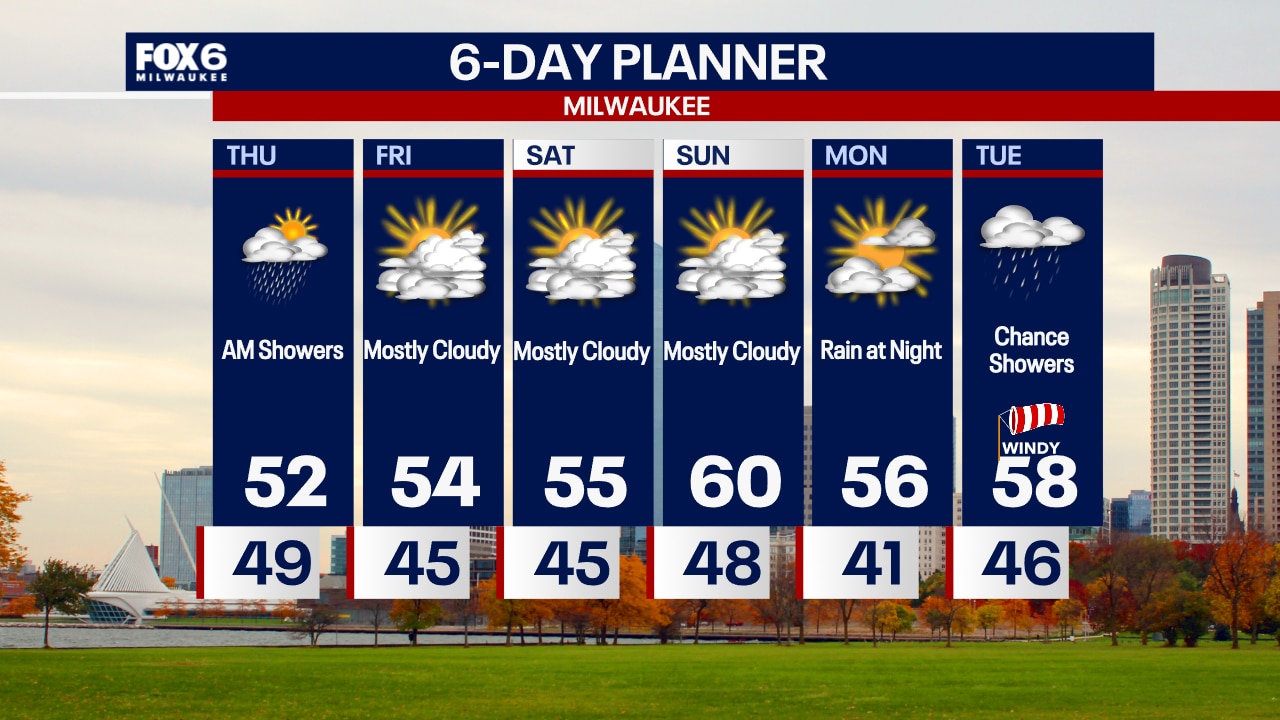 Rainy overnight with temperatures between 45 and 50. Light rain on Thursday morning ending around noon. Mostly cloudy with highs in the low 50s.