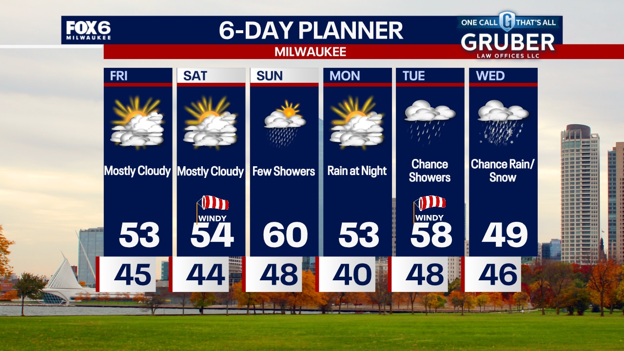 Cloudy and drizzly at times this evening. Temperatures will hold steady in the 40s. Mostly cloudy on Friday with highs in the low 50s. Highs in the mid-50s on Saturday and around 60 on Sunday.