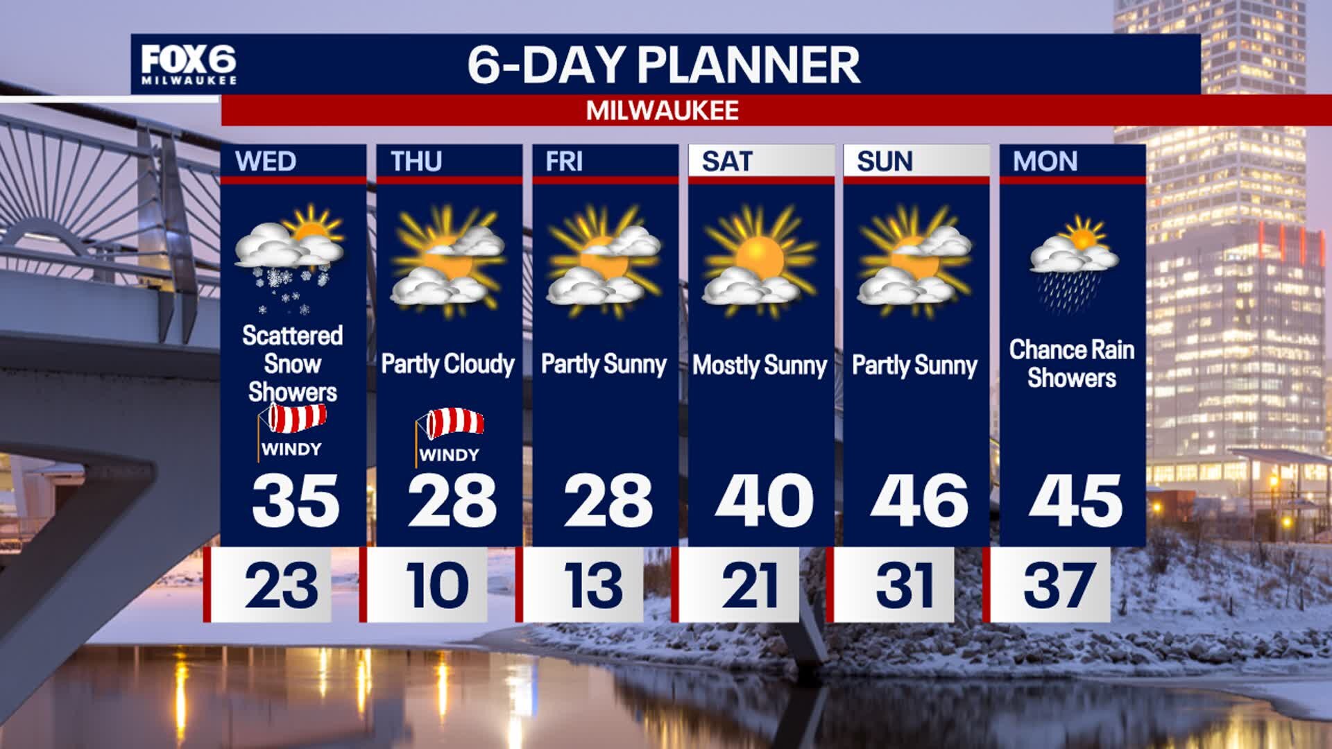 Scattered snow showers expected this afternoon with bursts of low visibility and light accumulation. It'll be windy with gusts up to 50mph. Temperatures drop into the single digits by morning with wind chills below 0. Staying in the 20s Thursday and Friday then a big warm up by the weekend.