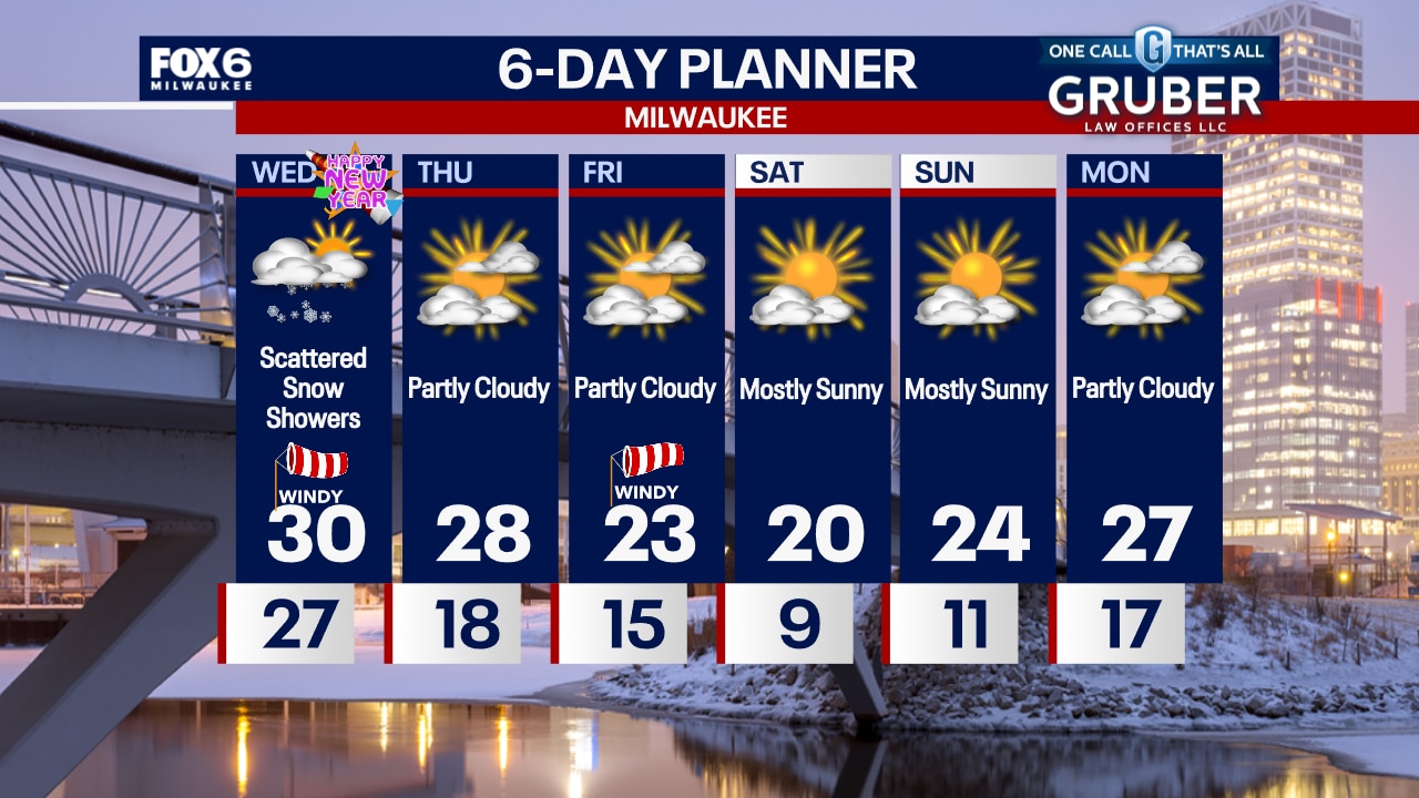 Scattered snow showers late this evening and overnight. Temperatures dropping below freezing. Scattered snow showers again on New Year's Day with a windy high around 30.