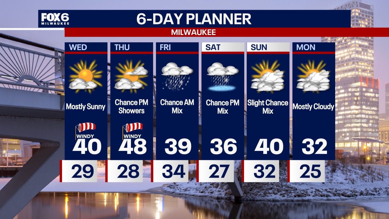 Mostly clear and windy overnight with temperatures falling through the 30s. Mostly sunny and windy on Wednesday with a high around 40.