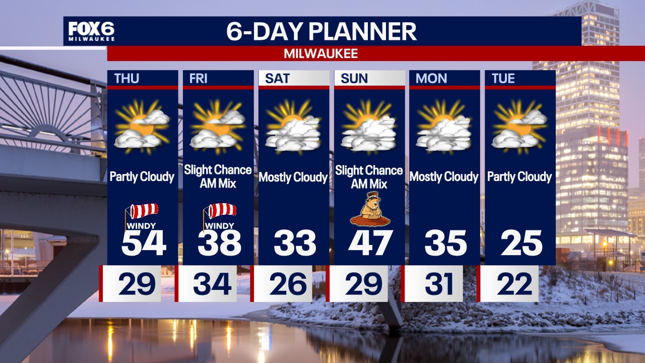 Mostly clear overnight with temperatures dropping into the 20s. Partly sunny, windy & warm on Thursday with a record high of 54.