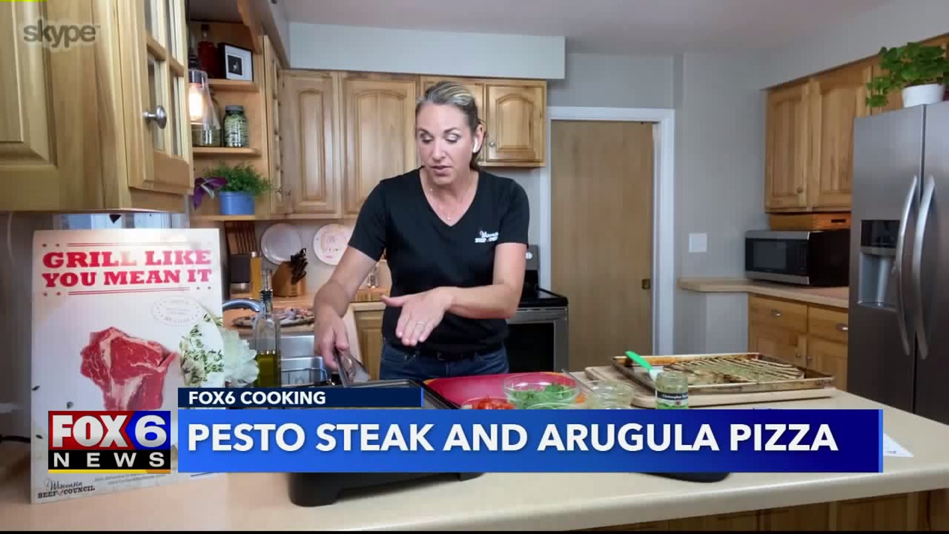 Pesto steak and arugula pizza