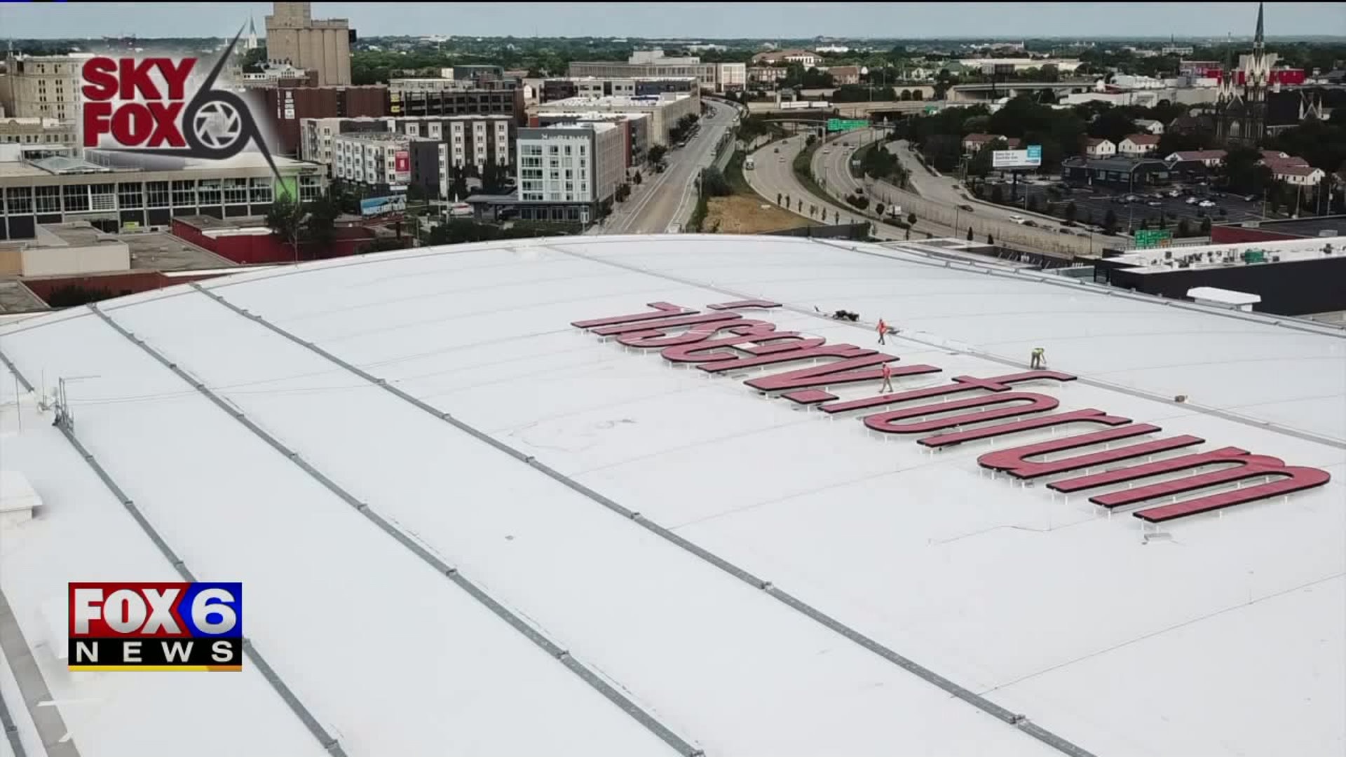Massive sign installed atop Fiserv Forum