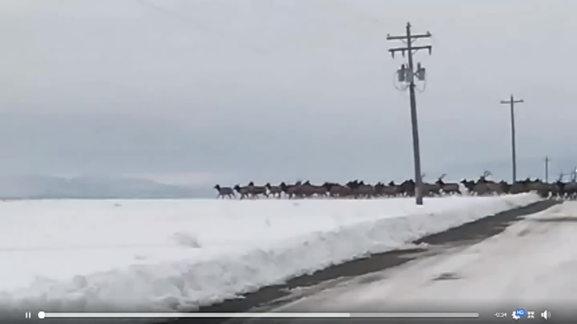 Elk cross snowy roadway