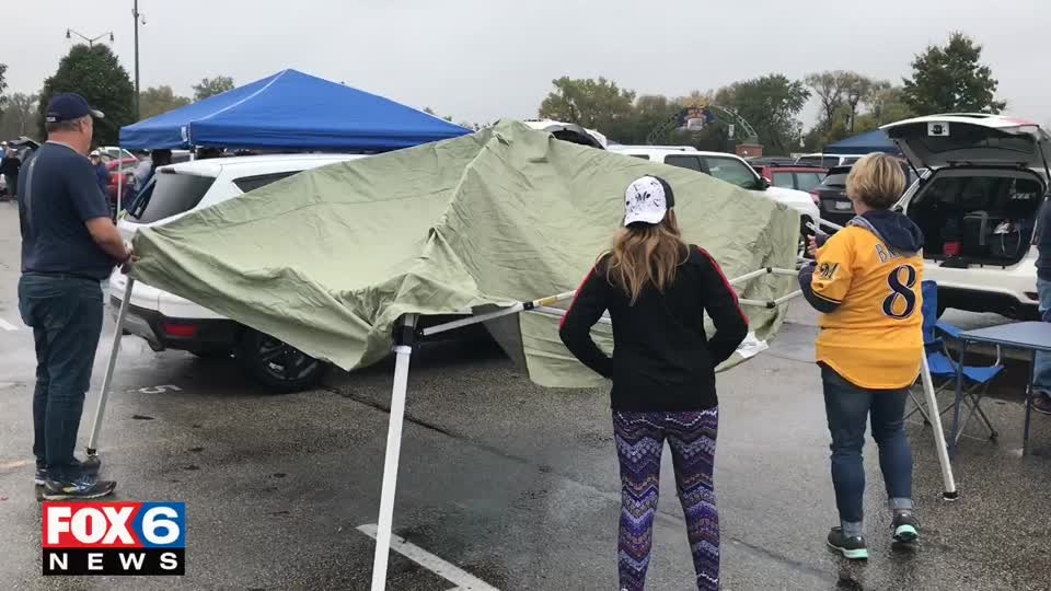 Brewers fans pack the parking lot of Miller Park tailgating and supporting the Brew Crew despite the wet weather.