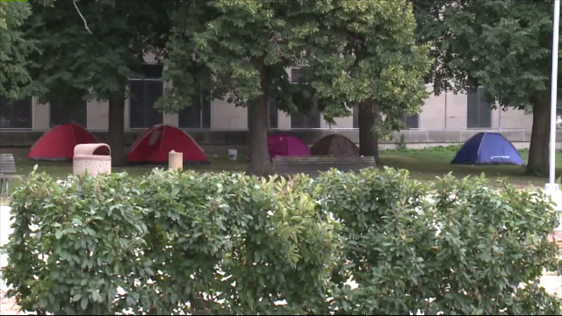 Homeless sleeping in tents in MacArthur Square