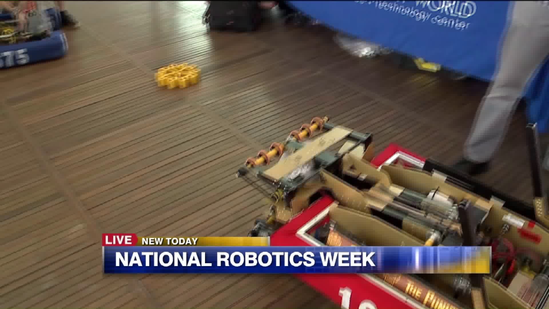 Carl talks with students about the robots they built