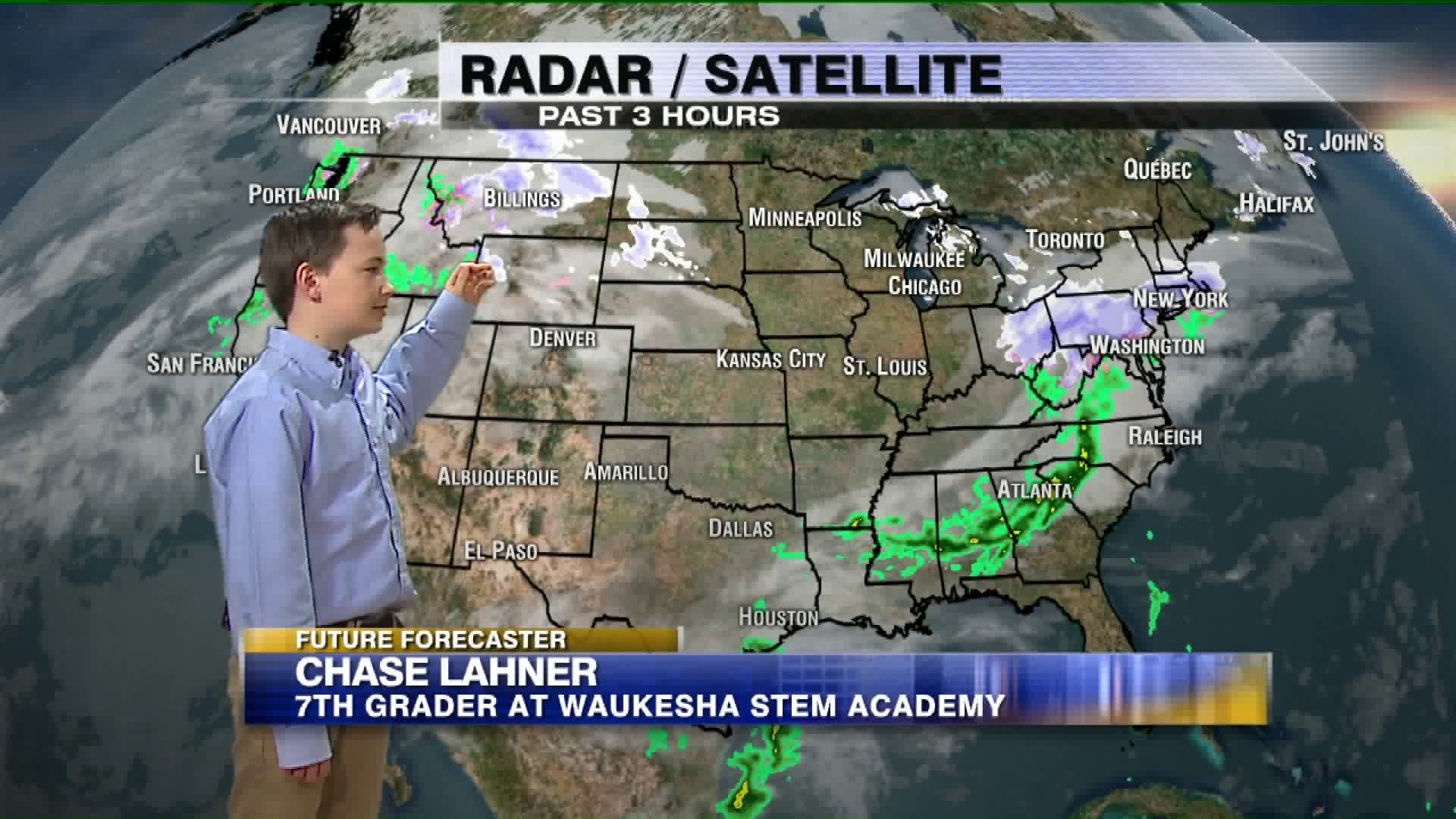Chase helps Meteorologist Rachael Kaye with the weather