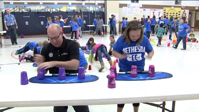 Kramp talks with 5th grade student about stacking