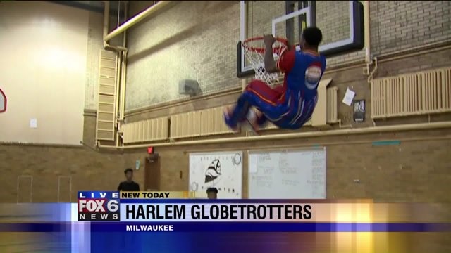 Harlem Globetrotter shows Carl how to do a high-flying dunk