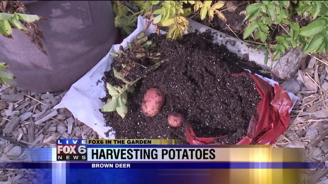 There are potatoes growing in several different ways in the garden