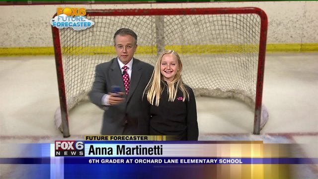 Anna Martinettie helps Meteorologist Rob Haswell with the weather