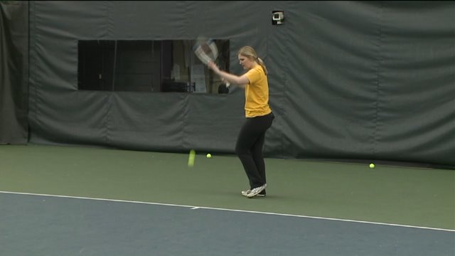 Laura and Chip square off in a game of tennis