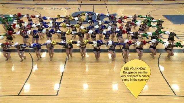 Chip enjoys a performance by the Badgerette Pom and Dance team