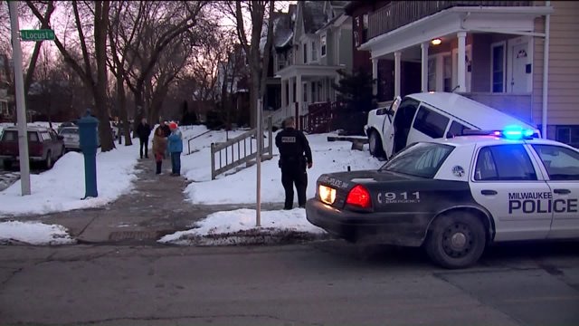 "It was crazy:" Man taken to the hospital after crashing van into porch near Locust & Farwell