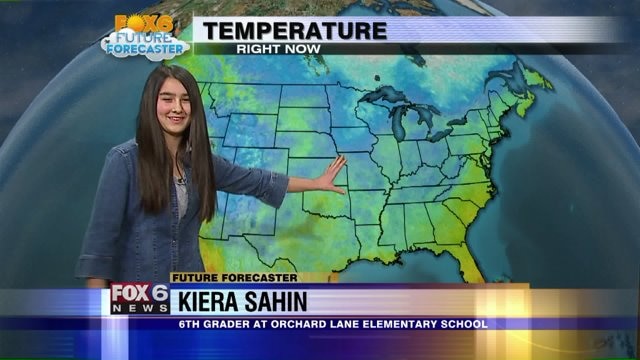 Kiera Sahin helps Meteorologist Rob Haswell with the weather