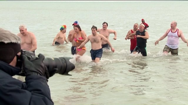 Folks brave the elements and take the Polar Bear Plunge into Lake Michigan