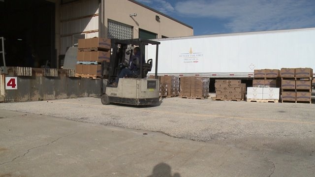 Volunteers fill bins with Thanksgiving dinner
