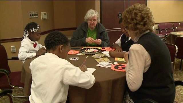 Students from St. Marcus School in Milwaukee spend time with seniors at Newcastle Place in Mequon