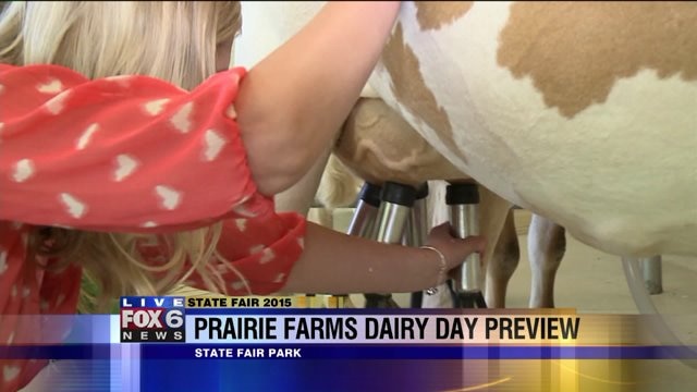 Laura learns how to milk a cow at Wisconsin State Fair