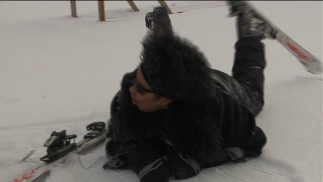 Cassandra learns how to use the pull rope, skis down hill