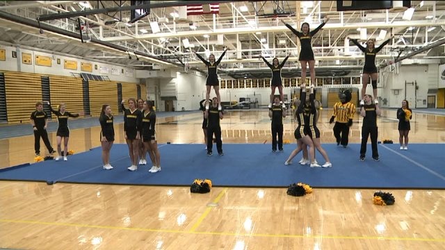 Chip hangs with the UWM Cheer and Stunt Team