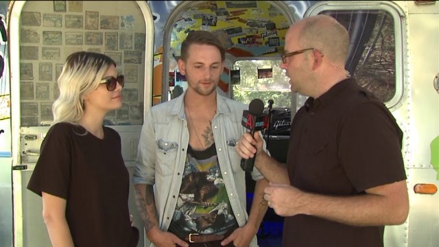 Brian Kramp talks with Sue Schrader and Jimmy Brown with Matrimony Band at Summer Sounds in Cedarburg