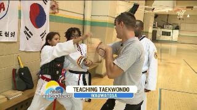 Chip talks with Taekwondo students, learns moves