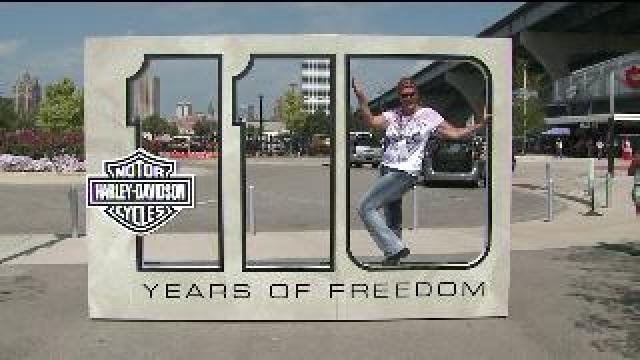 Harley riders enjoy taking pictures with massive cut-out