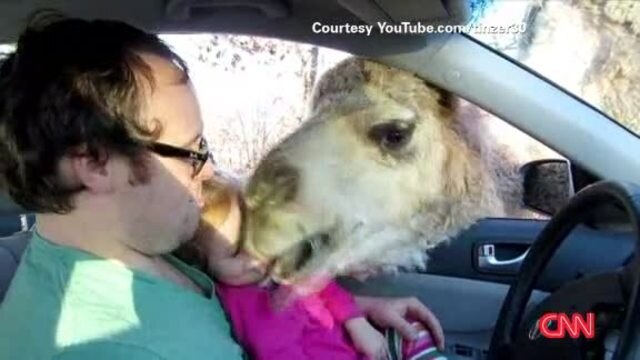 Camel closes jaws on giggling toddler's head
