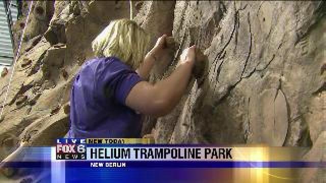 Laura checks out rock climbing wall at Helium Trampoline Park