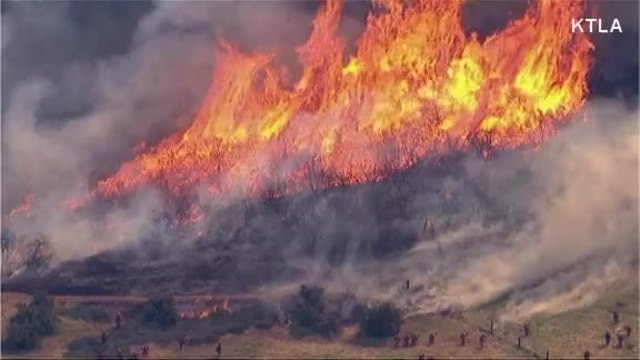 Brush fire rages on in Southern California (Aerials)