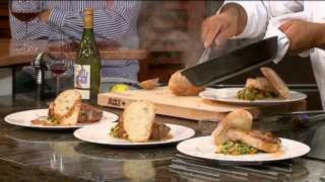 Chef puts the roasted tomato salsa and pork chops together