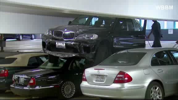BMW misses parking spot, lands on luxury cars
