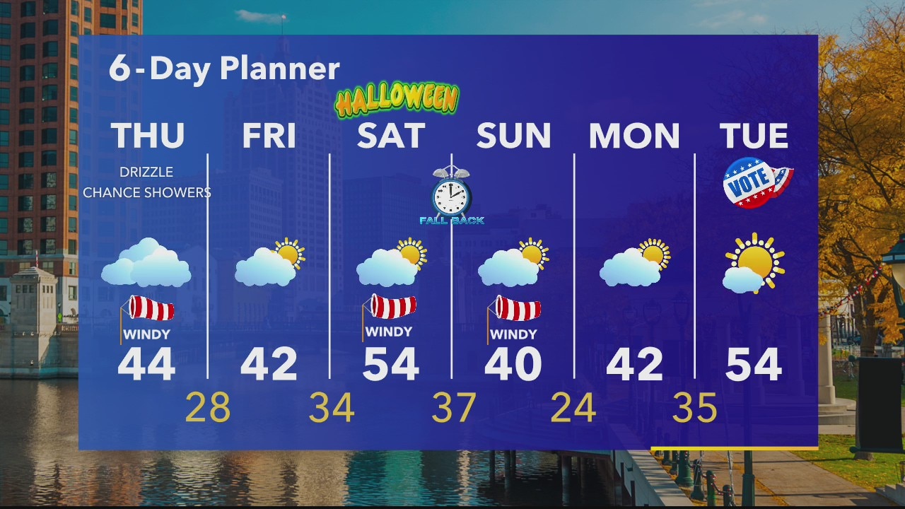 Mostly cloudy with a chance for patchy drizzle and a few showers. Much cooler with highs in the low 40s. Windy today with a strong N/NE wind 10-20mph gusting into the 30mph range at times. Calmer tomorrow but cooler with highs in the low 40s. We do warm up for Halloween as highs get back to the low to mid 50s.