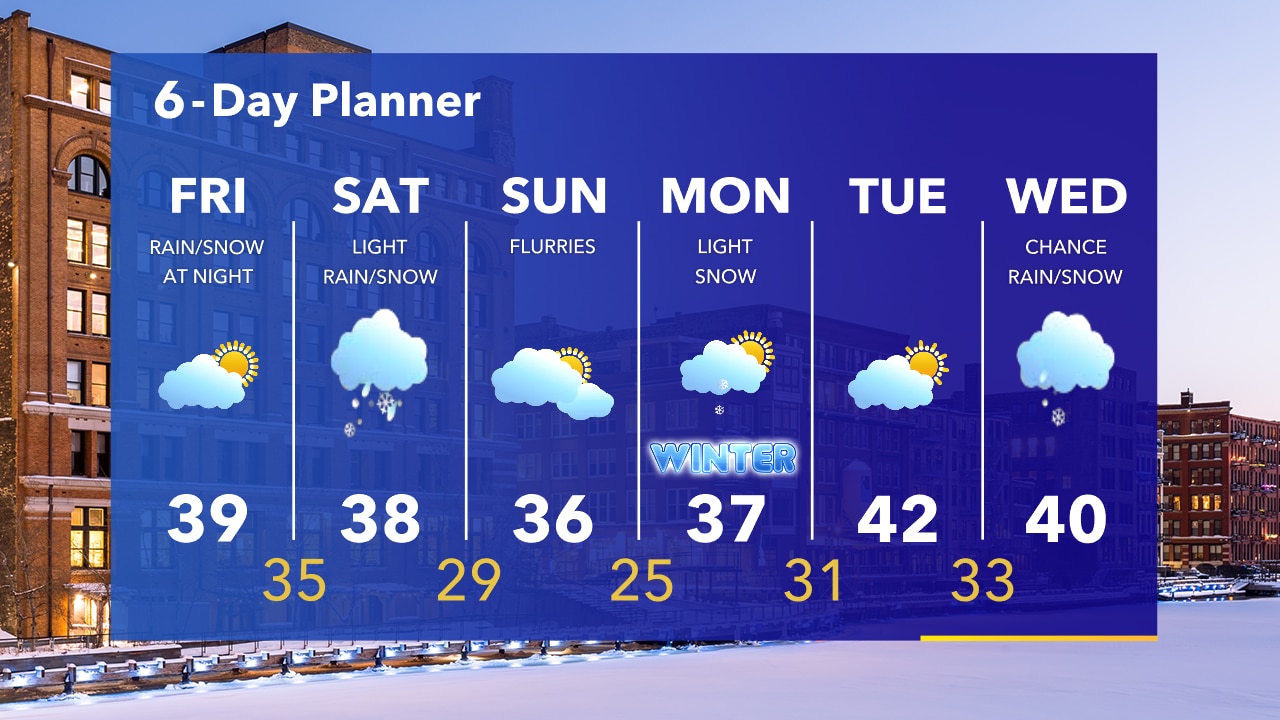 Clearing skies overnight with temperatures in the 20s. We will wake up to some sun on Friday before clouds increase. Highs near 40. Our next chance for a few rain/snow showers moves in Friday night into Saturday.