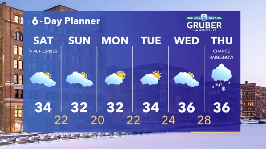 Few flurries tonight and tomorrow otherwise, more of the same this weekend: clouds and temps in the 30s. Some sun possible early next week.