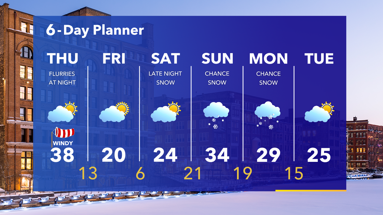 The wind will continue tonight with a few clouds rolling through. Temperatures in the 20s. More sun on Thursday with a windy high in the upper 30s. Much cooler Friday.