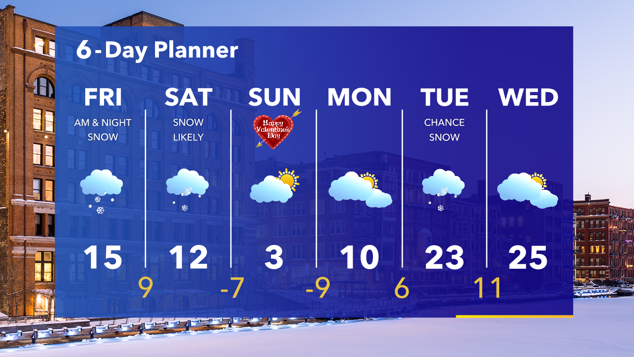 Snow moving in this evening and lasting until 8-9am Friday. 1-2" of accumulation. Round 2 moves in late Friday night into Saturday.