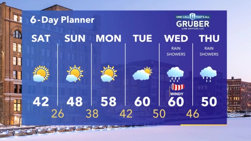 Quiet and clear tonight with lows in the 20s. Low 40s Saturday then upper 40s Sunday. 50s and low 60s much of next week with rain Wednesday.