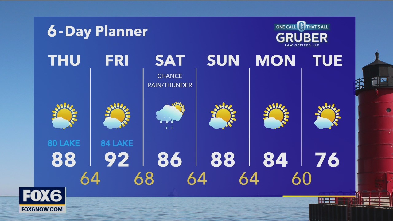 Another hot and humid day with highs in the upper 80s to near 90 inland. A southeast wind will keep things cooler near the lake. Dewpoints will once again be in the mid to upper 60s for a very muggy day.