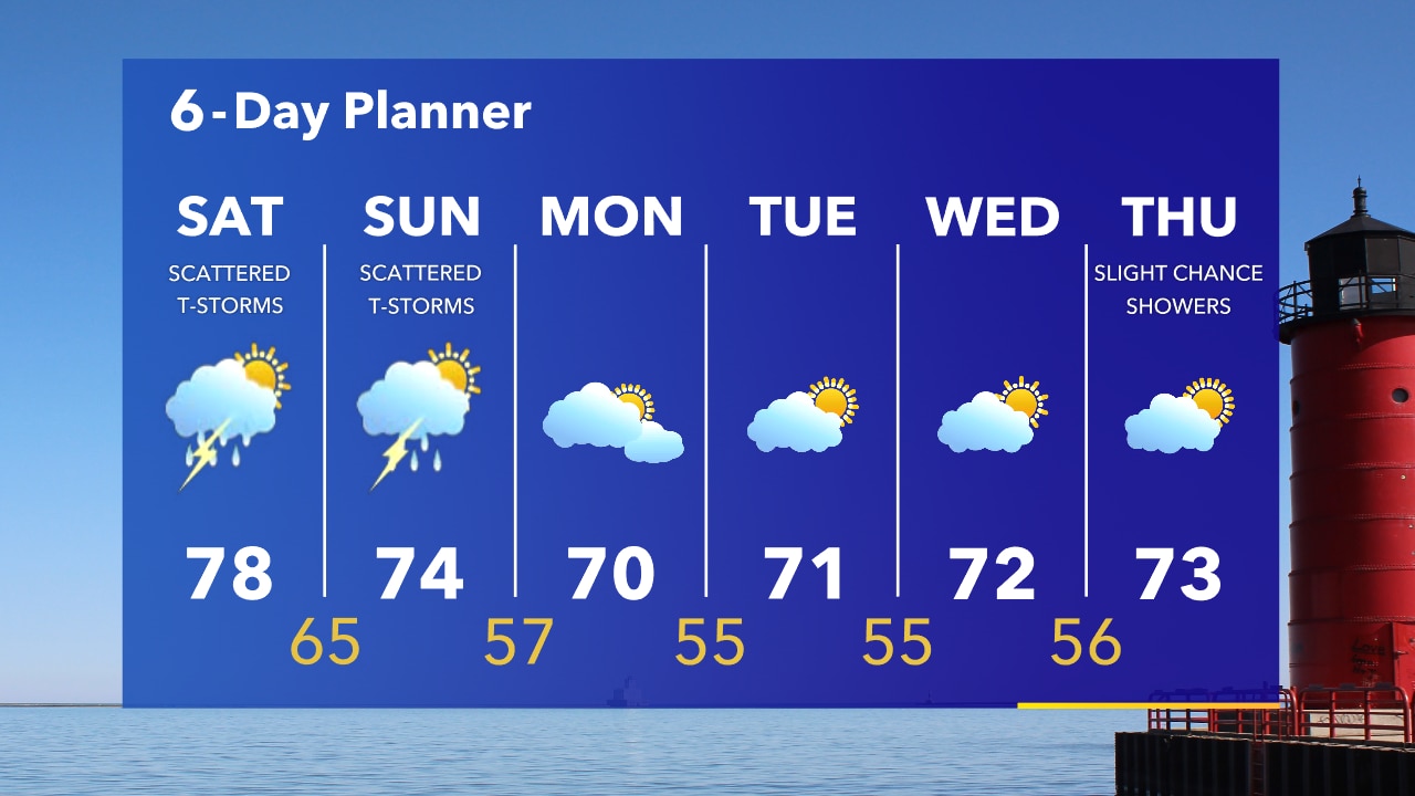 Patchy fog overnight with an isolated shower or t-storm possible. Temperatures in the 60s. Humid this weekend with off-and-on t-storms and highs in the 70s.
