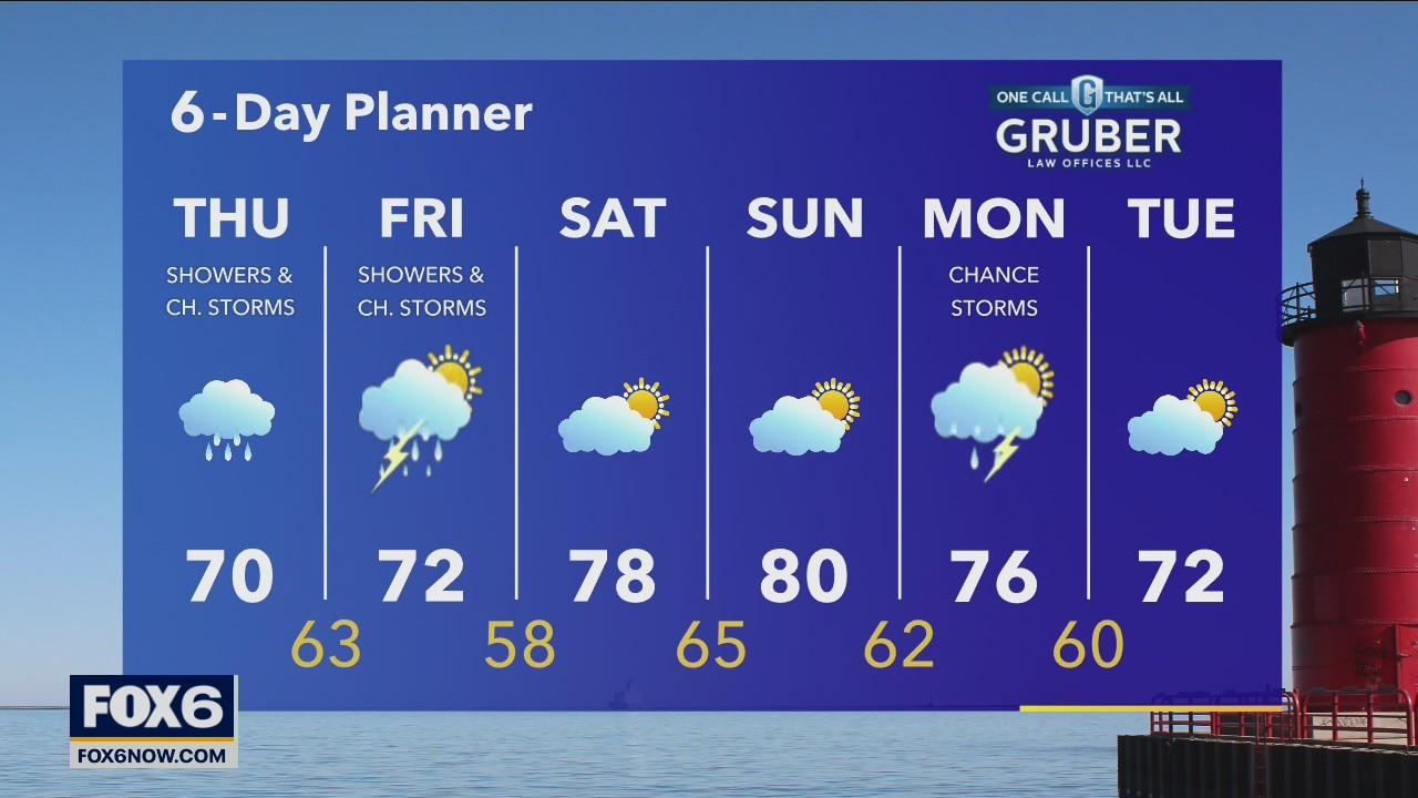 A low drifts north from Missouri, over Wisconsin and into Michigan over the next day or two. Rain is likely today with a chance for thunderstorms. Rain and thunderstorms are possible again tomorrow.