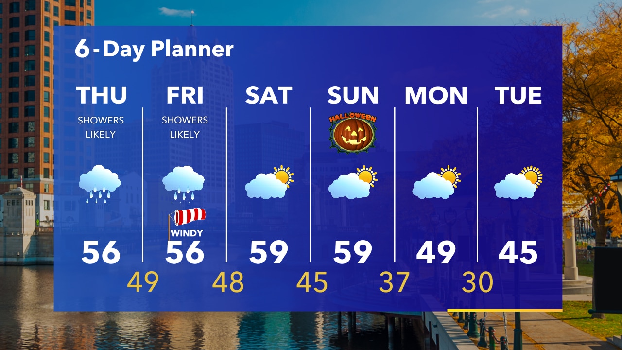 Cloudy and breezy overnight with temperatures in the 40s to low 50s through sunrise. Light rain Thursday morning with steady rain late in the day and especially at night.