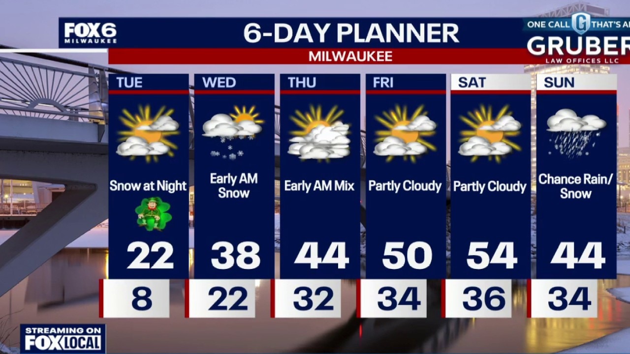 Snow is tapering off this evening but blowing snow will be a possibility through the night. Temperatures will drop into the single digits overnight with wind chills below 0. It's going to be a cold St. Patrick's Day! Another round of light snow expected Tuesday night with up to 1" of accumulation possible. Warming back to 50s late in the week.