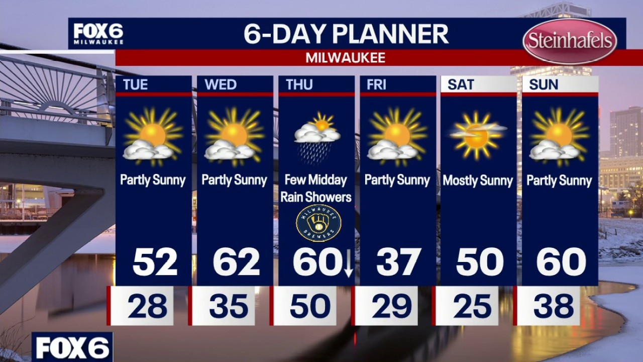 Partly cloudy overnight with lows in the upper 20s by sunrise. Partly sunny and warmer on Tuesday with highs in the low 50s. Warm and breezy on Wednesday with highs in the low 60s.
