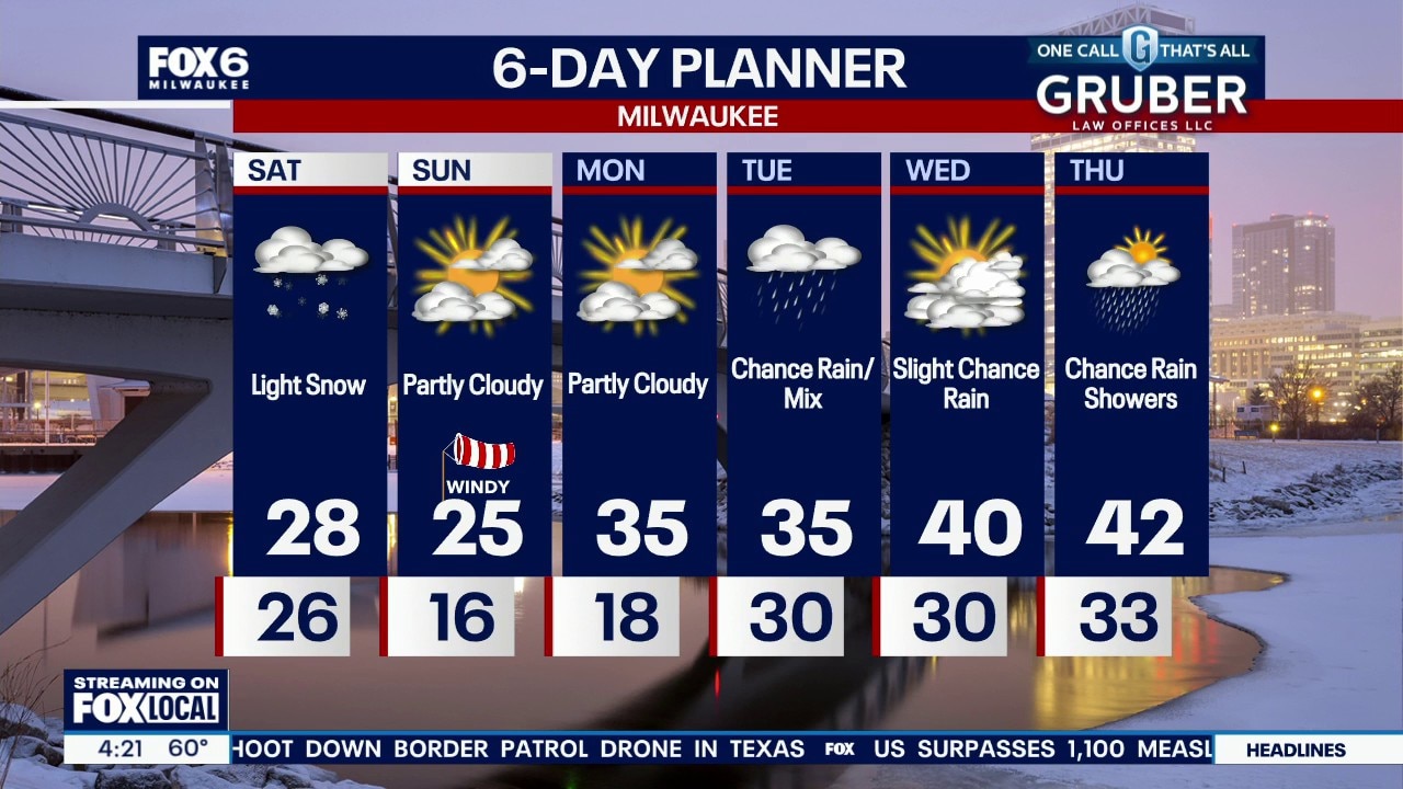 Temperatures drop back into the 20s this weekend with light snow during the day Saturday. Snowfall totals will range from 2-4" far north, an inch or two around Milwaukee, and less than an inch near the IL state line. Not a huge storm, but watch for slushy or slippery spots while traveling. Cold Sunday, then gradually warming next week. There are a few more chances for rain and possibly wintry mix.
