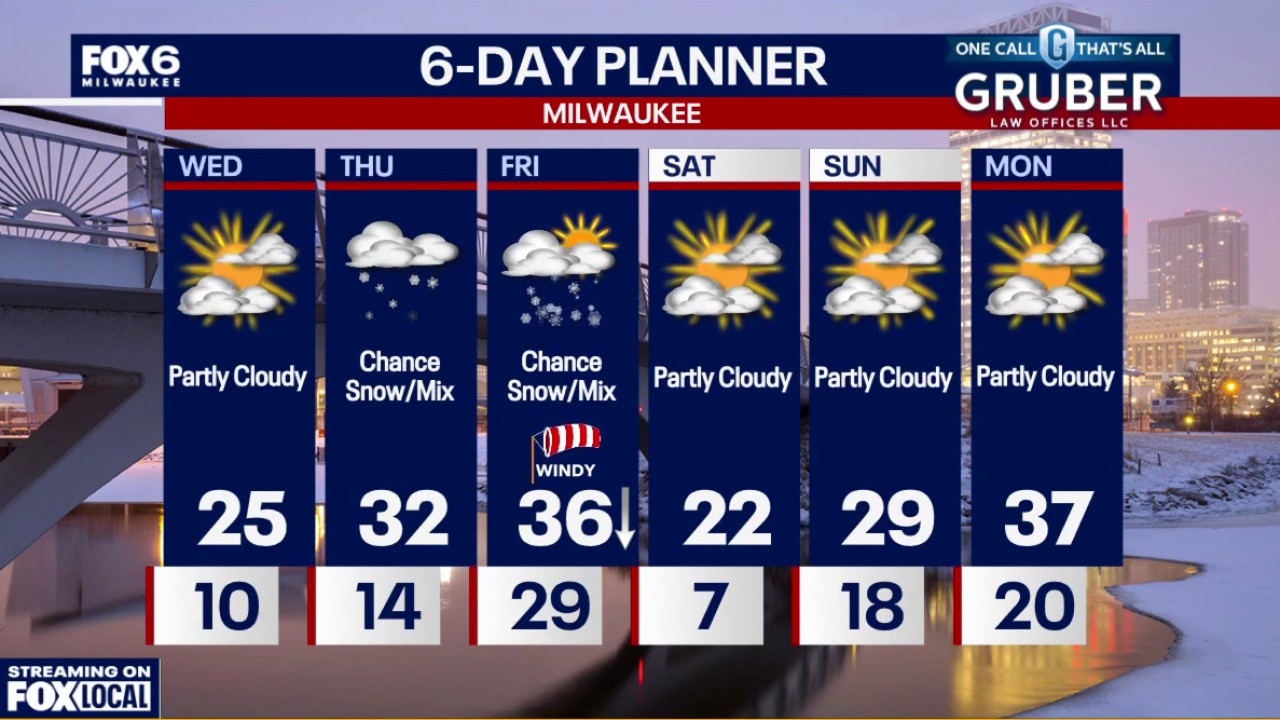 Partly cloudy morning. Temperature colder inland (single digits) to low teens near the lake with a few flurries possible. Partly sunny on Wednesday with highs in the mid-20s.