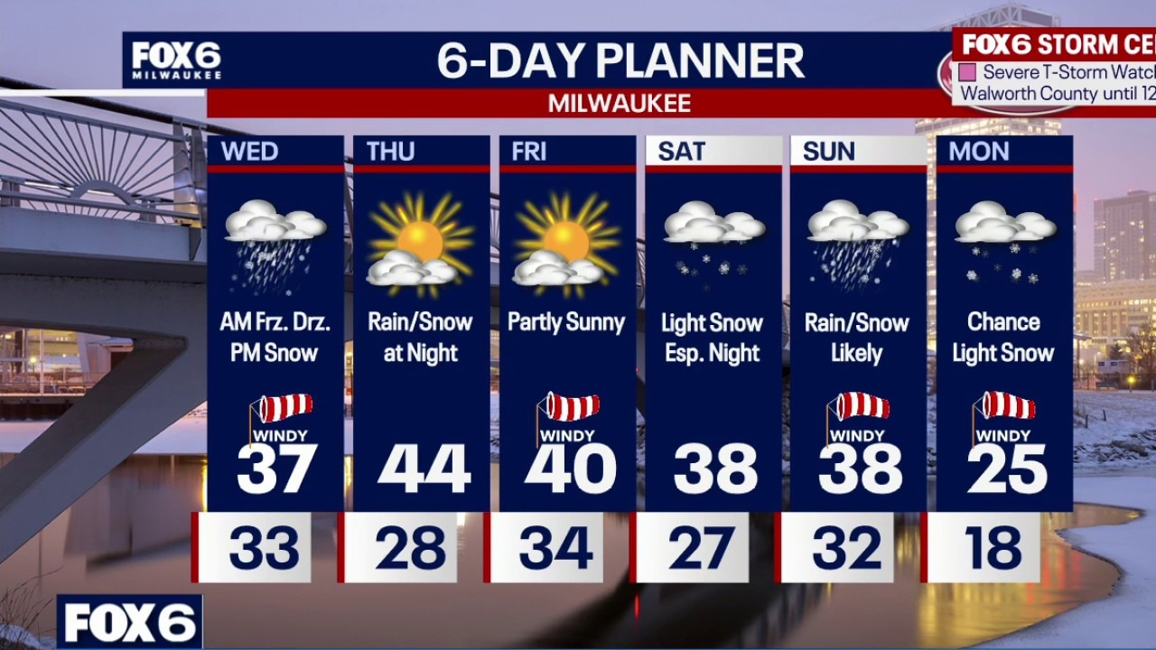 Winter Weather Advisory Sheboygan & Fond du Lac counties from 1am to 1pm on Wednesday Severe T-Storms with hail and wind ending overnight. Windy and cold with temperatures in the 30s. Freezing drizzle and light freezing rain possible on Wednesday morning, especially north of Milwaukee. This could cause a glazing of ice on untreated surfaces. Temperatures at/below 32 north of MKE.
